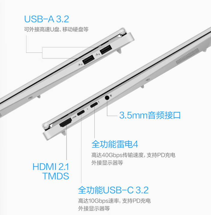 在接口配置上,华硕无畏Pro162026酷睿版做到了全场景覆盖,配备1×全功能雷电4、1×全功能USB-C3.2(10Gbps)、2×USB-A3.2、1×HDMI2.1TMDS以及3.5mm音频接口。其中,雷电4接口传输速度高达40Gbps,支持PD充电与外接显示器;全功能USB-C3.2接口同样支持PD充电与外接显示,配合HDMI2.1TMDS接口,可轻松连接投影仪、外接显示器、高速U盘、移动硬盘等多种设备,扩展性极强,满足专业创作与娱乐拓展的双重需求。